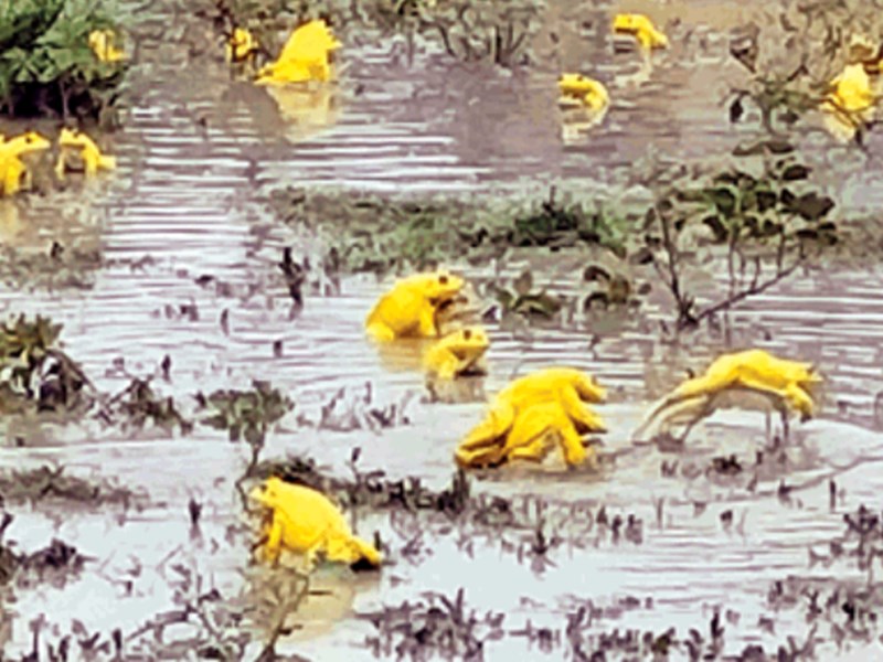 नरसिंहपुर। जिला मुख्यालय से करीब 20 किमी दूर आमगांव में दुर्लभ प्रजाति के पीले मेंढ़कों के झुंड़ ने ग्रामीणों के बीच कौतूहल पैदा कर दिया। गांव के एक स्थान पर भरे पानी में करीब दो दर्जन से अधिक भारतीय पीले मेंढ़क चहलकदमी करते दिखे। दो-तीन दिन पहले हुई बारिश के बाद आमगांव में अचानक से पीले मेंढ़कों का झुंड़ निकलते ही ग्रामीण अचरज में पड़ गए। इसके पहले तक वे काले, हल्का पीलापन लिए या हरे रंग के ही मेंढ़क देख चुके थे, लेकिन पूरी तरह पीलापन लिए इन मेंढ़कों को उन्होंने पहली बार देखा था। इन मेंढ़कों की आवाज भी आम मेंढ़कों से अलग कर्कश भरी थी, जो आमलोगों को उत्सुकता के साथ कहीं न कहीं डरा भी रही थी। पीले मेंढ़कों को लेकर जंतु विशेषज्ञों का कहना है कि ये खतरनाक नहीं, बल्कि आम मेंढ़कों की ही तरह हैं।