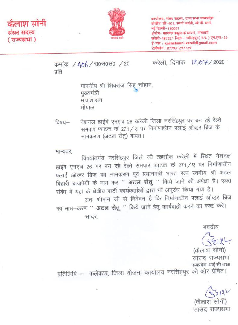 नगर के फ्लाई ओवर का नाम अटल सेतु रखने हेतु राज्यसभा सभा सांसद श्री कैलाश सोनी ने लिखा मुख्यमंत्री शिवराज सिंह चौहान को पत्र। करेली में स्थित नेशनल हाईवे एनएच 26 पर बन रहे रेलवे समपार फाटक पर निर्माणाधीन फ्लाई ओवर ब्रिज का नामकरण पूर्व प्रधानमंत्री भारत रत्न स्वर्गीय श्री अटल बिहारी वाजपेई के नाम कर अटल सेतु किए जाने की हेतु पत्र।