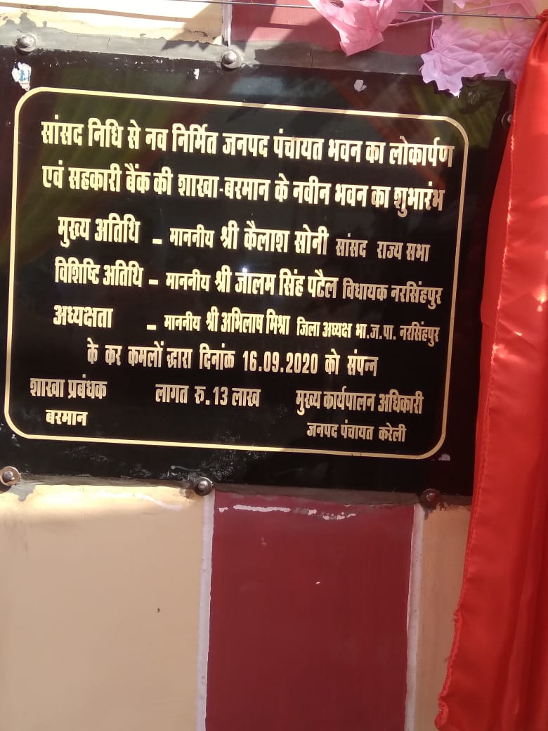 तहसील करेली के अन्तर्गत आने वाले ग्राम पंचायत बरमान कला में राज्य सभा सांसद निधि से निर्मित भवन का लोकार्पण राज्यसभा सांसद मा,कैलाश सोनी वि, अतिथि पूर्व राज्यमंत्री जालम सिंह पटेल के साथ जिला भाजपा अध्यक्ष अभिलाष मिश्रा , जिला सोसाइटी अध्यक्ष वीरेंद्र फोजदार के कर-कमलों से गत दिवस फीता काटा गया