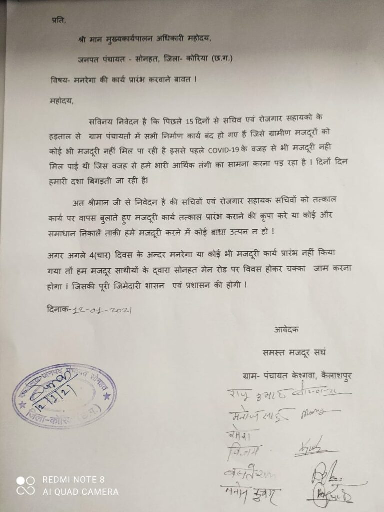 क्योंकि ग्रामीण क्षेत्रों में मनरेगा ग्रामीणों की आय का मुख्य स्रोत है और रोजगार सहायकों के हड़ताल में होने की वजह से मजदूर घर में बैठे हैं और उनकी आय का मुख्य स्रोत बंद होने के कारण परिवार का भरण पोषण करने में काफी दिक्कत हो रही है जिसके कारण कल ग्रामपंचायत कैलाशपुर तथा केशगंवा के ग्रामीणों ने अनुविभागीय अधिकारी को ज्ञापन देकर अपनी समस्या बताई और समाधान नहीं होने की दशा में आंदोलन की चेतावनी दी।