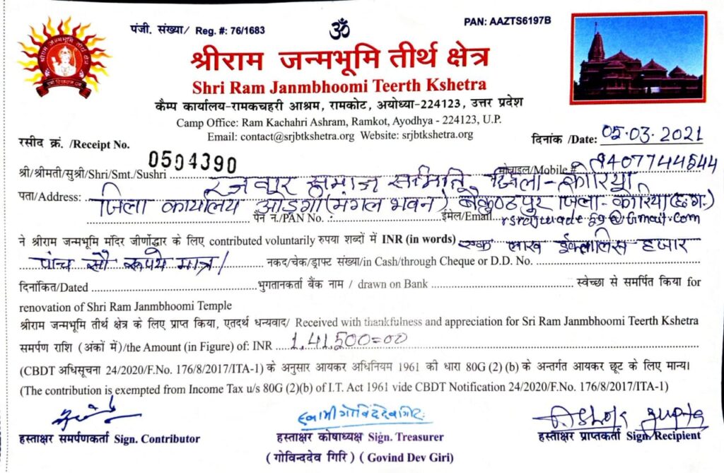 सोनहत– अयोध्या में बन रहे श्री राम मंदिर निर्माण के लिए रजवार समाज कोरिया के द्वारा 141500 रुपये की सहयोग राशि दान की गई इस हेतु रजवार समाज कोरिया के द्वारा राष्ट्रीय स्वयंसेवक संघ कोरिया बैकुंठपुर नगर बौद्धिक प्रमुख श्री अशोक गुप्ता जी को समाज के सभी क्षेत्र समिति से राशि का संग्रहण किया गया