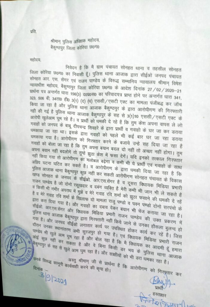 सोनहत– विकासखंड सोनहत के तत्कालीन जनपद सीईओ आर एस सेंगर व एक अन्य पर न्यायालय के आदेश पर सात माह पूर्व मामला दर्ज हुआ था पर गिरफ्तारी आज तक नहीं हो सकी है और वर्तमान में सीईओ साहब सूरजपुर जिले में अपनी सेवाएं दे रहे हैं, आरोपियों की आजतक गिरफ्तारी की मुख्य वजह इनकी पहुंच और जबरदस्त राजनीतिक पकड़ को माना जा रहा है।