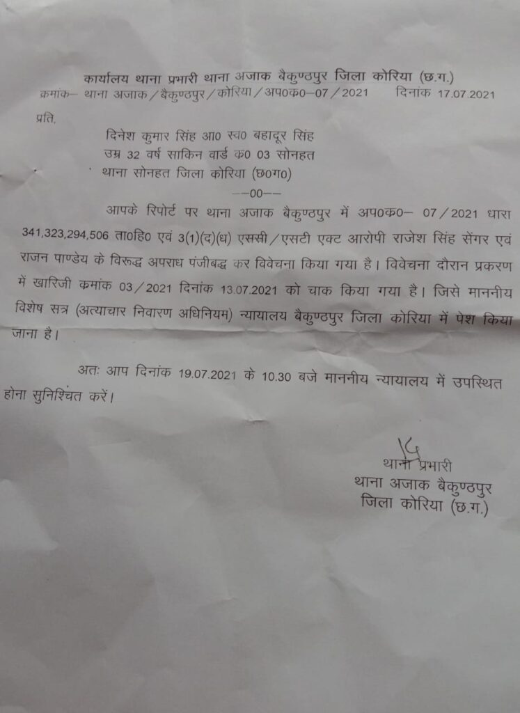 गिरफ्तारी के बजाय पुलिस खात्मे के प्रयास में– न्यायालय के आदेश पर दिनांक 27/02/2021 को जनपद सीईओ आर एस सेंगर व अन्य एक पर धारा 341,323,294,506 ताo हिo एवं 3(1)(द)(ध) एससी/एसटी एक्ट के तहत मामला दर्ज हुआ था लेकिन आरोपियों की गिरफ्तारी करने के बजाए पुलिस खात्मे के प्रयास में लग गई और पीड़ित दिनेश सिंह को दिनाँक 17/07/2021 को नोटिस जारी कर बताया कि विवेचना के दौरान प्रकरण खारिज क्रमo 03/2021 दिनाँक 13/07/2021 को चाक किया गया है जिसे न्यायालय में पेश किया जाना है अतः आप दिनाँक 19/07 2021 को न्यायालय में उपस्थित होवें जिससे स्पष्ट है कि आरोपियों की ऊंची पहुंच और जबरदस्त राजनीतिक पकड़ की वजह पुलिस भी बेबस नजर आ रही है।