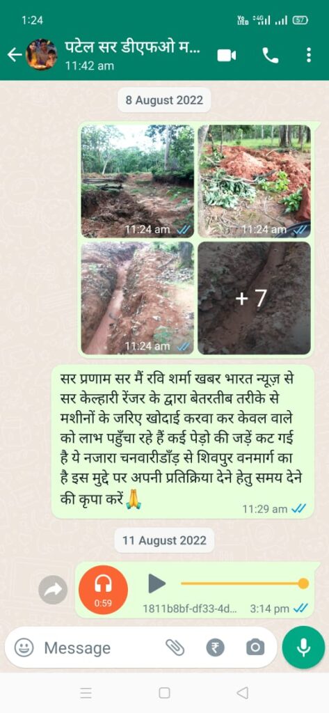 केल्हारी- वनपरिक्षेत्र केल्हारी में बिना अनुमति जियो कम्पनी द्वारा जेसीबी मशीन लगाकर वनपरिक्षेत्र में खोदाई कर केबल बिछाया जा रहा है और इसकी जानकारी वनमंडलाधिकारी को भी है लेकिन आज तक संबंधित केबल बिछाने वाले ठेकेदार पर कोई कार्यवाही नहीं हो रही है जिससे सहज ही अंदाजा लगाया जा सकता है कि सबकुछ साहब की मिलीभगत से हो रहा है इस सम्बंध में कई बार केल्हारी वनपरिक्षेत्राधिकारी रामसागर कुर्रे से उनका पक्ष जानने का प्रयास किया गया लेकिन न तो साहब ऑफिस में मिलते हैं और न ही फोन उठाते हैं बाद में डीएफओ श्री लोकनाथ पटेल को व्हाट्सएप के माध्यम से लगभग एक माह पूर्व सूचना दी गई कि वनपरिक्षेत्र केल्हारी के अंतर्गत ग्राम चनवारीडाँड़ से शिवपुर वनमार्ग में केबल कंपनी द्वारा जेसीबी मशीन से अवैध खोदाई कर कई वृक्षों की जड़ों को नुकसान पहुँचाया जा रहा है तो साहब पत्रकार को ही संबंधित ठेकेदार पर एफआईआर कराने की सलाह देने लगे अब सवाल है कि अगर जंगल की रक्षा का जिम्मा भी पत्रकार उठायेंगे तो विभाग के अधिकारियों की क्या जिम्मेदारी बनती है बहरहाल इन सब के बीच ठेकेदार का काम बिना रोकटोक जारी है और कुछ ही दिनों में ठेकेदार अपना काम खत्म करके चले जायेंगे और जो बेशकीमती वृक्ष व जंगल की जमीन बर्बाद होगी उसका कोई जिम्मेदार नहीं होगा और हो भी क्यों यदि नियमों को ताक में रखकर कुछ पेड़ बर्बाद होते हैं तो हों यदि इस जगह कोई ग्रामीण पेड़ काटे तो इन्हीं अधिकारियों के पास लंबी चौड़ी गाइडलाइन मौजूद है।