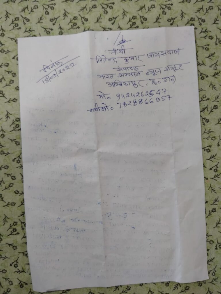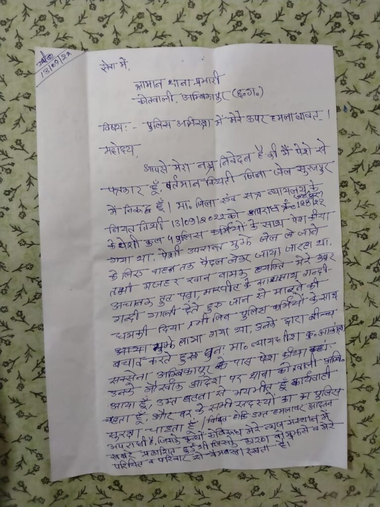 अम्बिकापुर शहर में कौन नही जानता गुंडे बदमाशो को किसका संरक्षण प्राप्त है नेता मंत्री संतरी की जरूरत बने गुंडे उत्पात मचा रहे है खुले आम बीच शहर पुलिस के कस्टडी में न्यायालय के सामने जान से मारने की घमकी देकर हमला कर रहे. यह वही मजहर है जो पत्रकार जितेंद्र कुमार जायसवाल के गिरफ्तार होने पर पुलिस की जयकार कर फूल माला से सम्मान किया था. आधुनिक युग मे जब छटे हुए गुंडे बदमाश व उनके गुर्गे सार्वजनिक रूप से पुलिस का जयकारा करने लगे तो समझा जा सकता की क्या चल रहा.फिलहाल जितेंद्र सुरक्षित है और उसने सभी जिम्मेदार अधिकारियों को पत्र लिखकर देने की बात कही है.