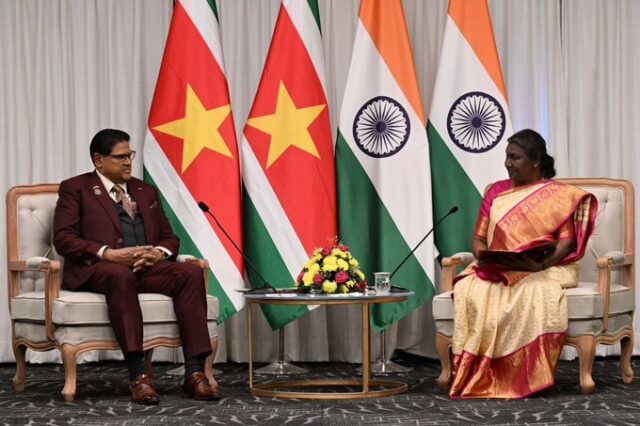 राष्ट्रपति द्रौपदी मुर्मु ने 17 वें पीबीडी में की सूरीनाम के राष्ट्रपति से मुलाकात……..