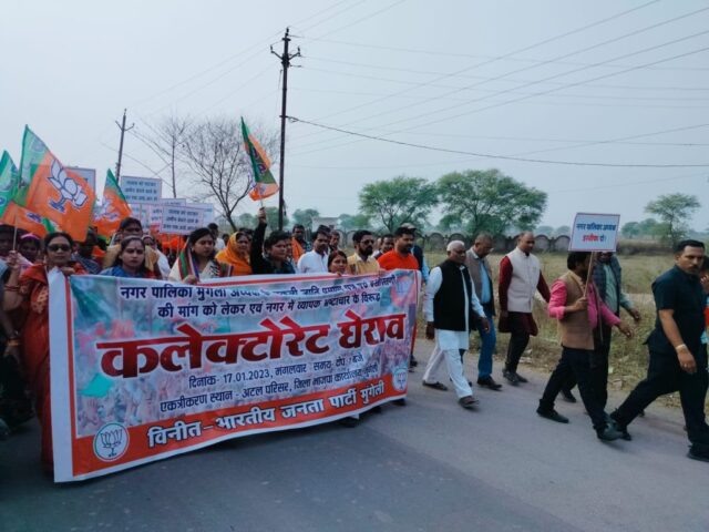 मुंगेली :- स्थानीय मुद्दों को लेकर बीजेपी ने हल्लाबोला है. विधायक पुन्नूलाल मोहले के नेतृत्व में भाजपा के कार्यकर्ताओं ने कलेक्ट्रेट का घेराव कर तीन बिंदुओं पर कलेक्टर को ज्ञापन सौंपा. प्रदर्शन के दौरान विधायक पुन्नूलाल मोहले ने कहा कि, कांग्रेस शासन में प्रदेश में अराजकता का माहौल बना हुआ है. धर्मांतरण रोका ना जा सके इसके लिए रासुका लागू किया गया है. वहीं भाजपाइयों ने मुंगेली नगर पालिका अध्यक्ष के फर्जी जाति प्रमाणपत्र की सप्रमाण शिकायत पर शासन के दबाव में कार्रवाई नहीं करने का आरोप लगाया है. इसके अलावा तालाब को अधिकारियों के संरक्षण में सुप्रीम कोर्ट के आदेश का उल्लंघन कर प्लॉट बनाकर बेचे जाने की शिकायत की गई. इन तमाम बातों को लेकर राज्यपाल के नाम ज्ञापन सौंपा गया.