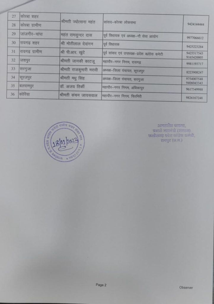 छत्तीसगढ़ में राज्यसभा सांसद, लोकसभा सांसद, पूर्व मंत्री, पूर्व विधायक महापौर और जिला पंचायत अध्यक्षों समेत 36 नेताओं को जिम्मेदारी सौंपी गई है. प्रभारी महामंत्री अमरजीत चावला ने जिला पर्यवेक्षकों की सूची जारी की है.