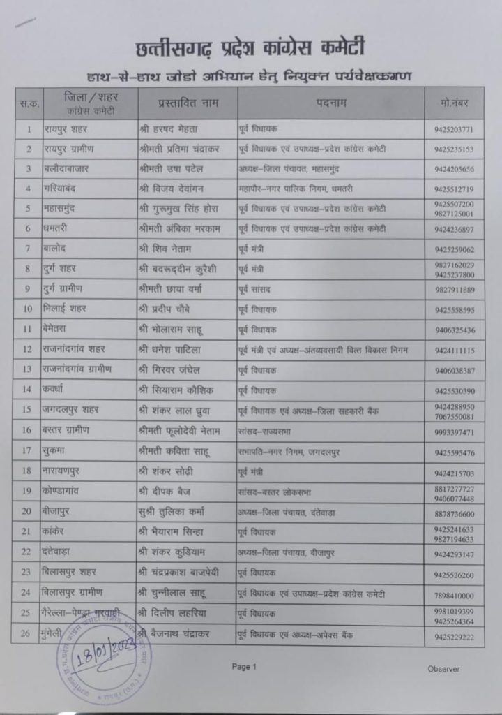 रायपुर :- राहुल गांधी की भारत जोड़ो यात्रा की समाप्ति के बाद 26 जनवरी को प्रियंका गांधी के नेतृत्व में कांग्रेस हाथ से हाथ जोड़ो यात्रा निकालेगी. इसी कड़ी में छत्तीसगढ़ में हाथ से हाथ जोड़ो अभियान के लिए पर्यवेक्षकों की नियुक्ति की गई है.