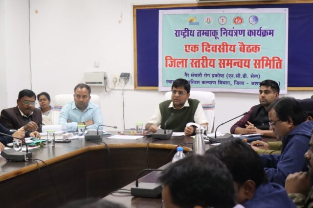 जशपुरनगर :- राष्ट्रीय तम्बाकू नियंत्रण कार्यक्रम के अंतर्गत जशपुर जिले में कोटपा एक्ट 2003 के तहत सिगरेट और अन्य तम्बाकू उत्पाद के प्रत्यक्ष व अप्रत्यक्ष रूप से विज्ञापन के रोक तथा उक्त अधिनियम के सभी धाराओं को प्रभावी रूप से क्रियान्वित करने हेतु विगत दिवस कलेक्टर डॉ. रवि मित्तल की अध्यक्षता में स्वास्थ्य विभाग की जिला स्तरीय समन्वय समिति की बैठक आयोजित किया गया था। इस अवसर पर जिला पंचायत सीईओ श्री जितेन्द्र यादव और स्वास्थ्य विभाग के अधिकारीगण उपस्थित थे।
