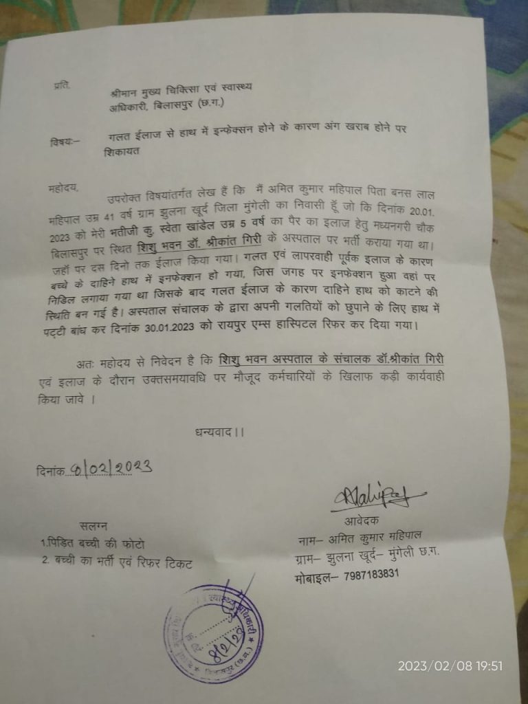 परिजनों ने डॉक्टरों पर लापरवाही का आरोप लगाया है. साथ ही परिजनों ने मुख्य चिकित्सा अधिकारी से मामले की शिकायत डॉक्टर और ड्यूटी में मौजूद स्वास्थ्य कर्मियों के खिलाफ कार्रवाई की मांग की है. परिजनों ने शिकायत पत्र में लिखा कि इलाज के दौरान मासूम के हाथ में निडिल लगाने के बाद इन्फेक्शन फैला है. जिसके बाद हफ्तेभर में हाथ पूरी तरह से काला हो गया है.