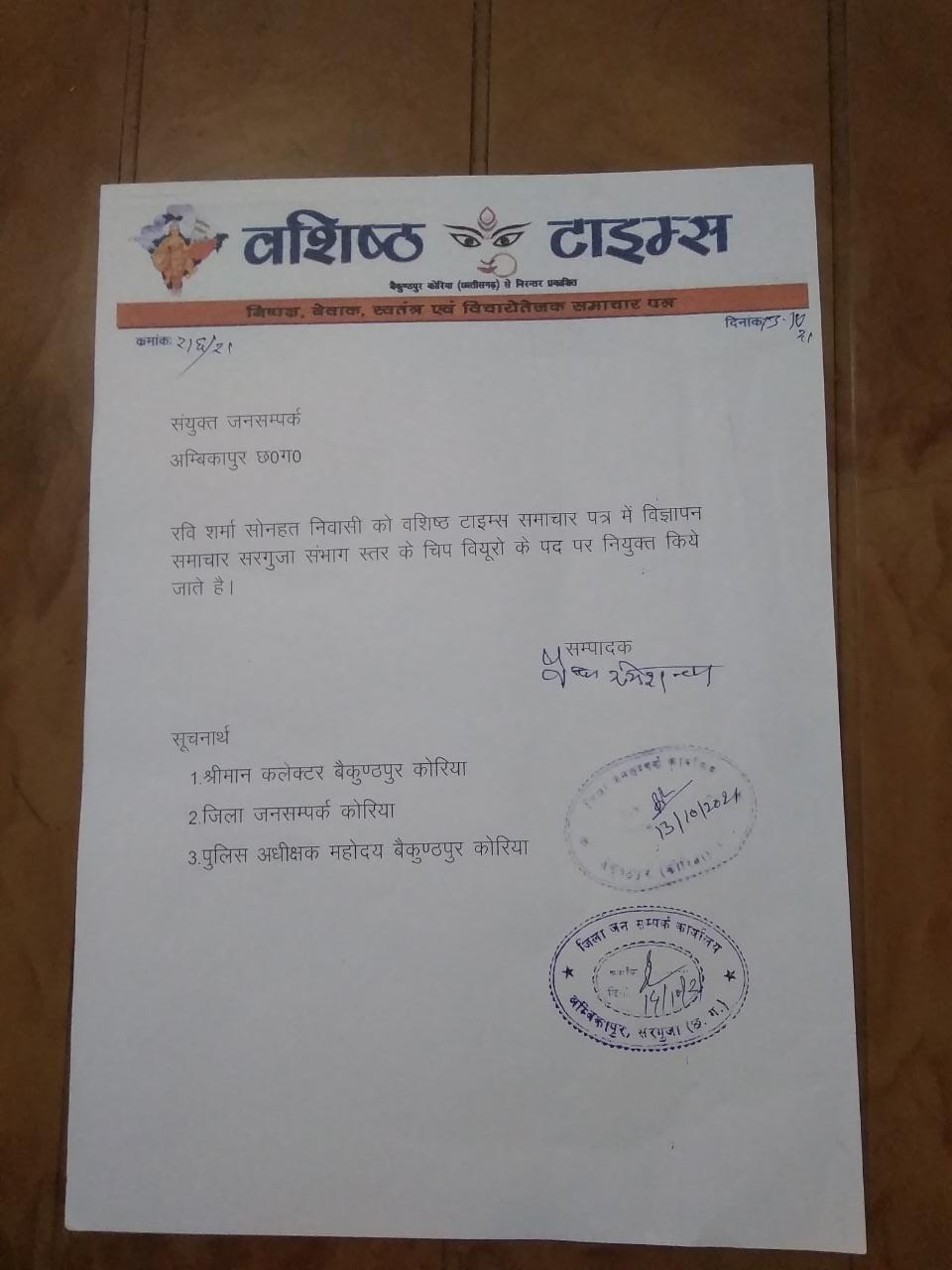 सोनहत ब्लाॅक में ऐसे पत्रकार हो चुके है कि जिसकी जानकारी दीपक जायसवाल ठेकेदार के द्वारा दिया गया है जो की घुघरा के निवासी है। नये पीढी के पत्रकार पैसे को लेकर उतावला हो रहे है। और अपनें को संगठन का पदाधिकारी व सदस्य बताते है। जब मौका आता है तो कोई संगठन साथ नहीं देता। एक समय ऐसा भी आया था जब ये पत्रकार एक केस में फसनें वाला था उस समय श्रीमान पुलिस अधिक्षक बीएस ध्रुव से संपादक ने बचाया था समय आनें पर याद दिला रहा हॅू। क्योंकि वशिष्ठ टाइम्स संपादक को गलत ढंग से किसी भी प्रकार से ठगा जाता है तो बर्दास्त नहीं होता है। इस संबंध में बैकुण्ठपुर कोरिया कलेक्टर से रूबरू संपादक ने आज की पत्रकारिता को लेकर चर्चा किया कि आज की पत्रकारिता व्यवसाय बन चुका है। आगे इस लेख पर कोई भी चर्चा किया गया तो संपूर्ण बाते लिखित में दिया जायेगा क्योकि मेरे यहां आज भी आपकी नियुक्ति पत्र है।