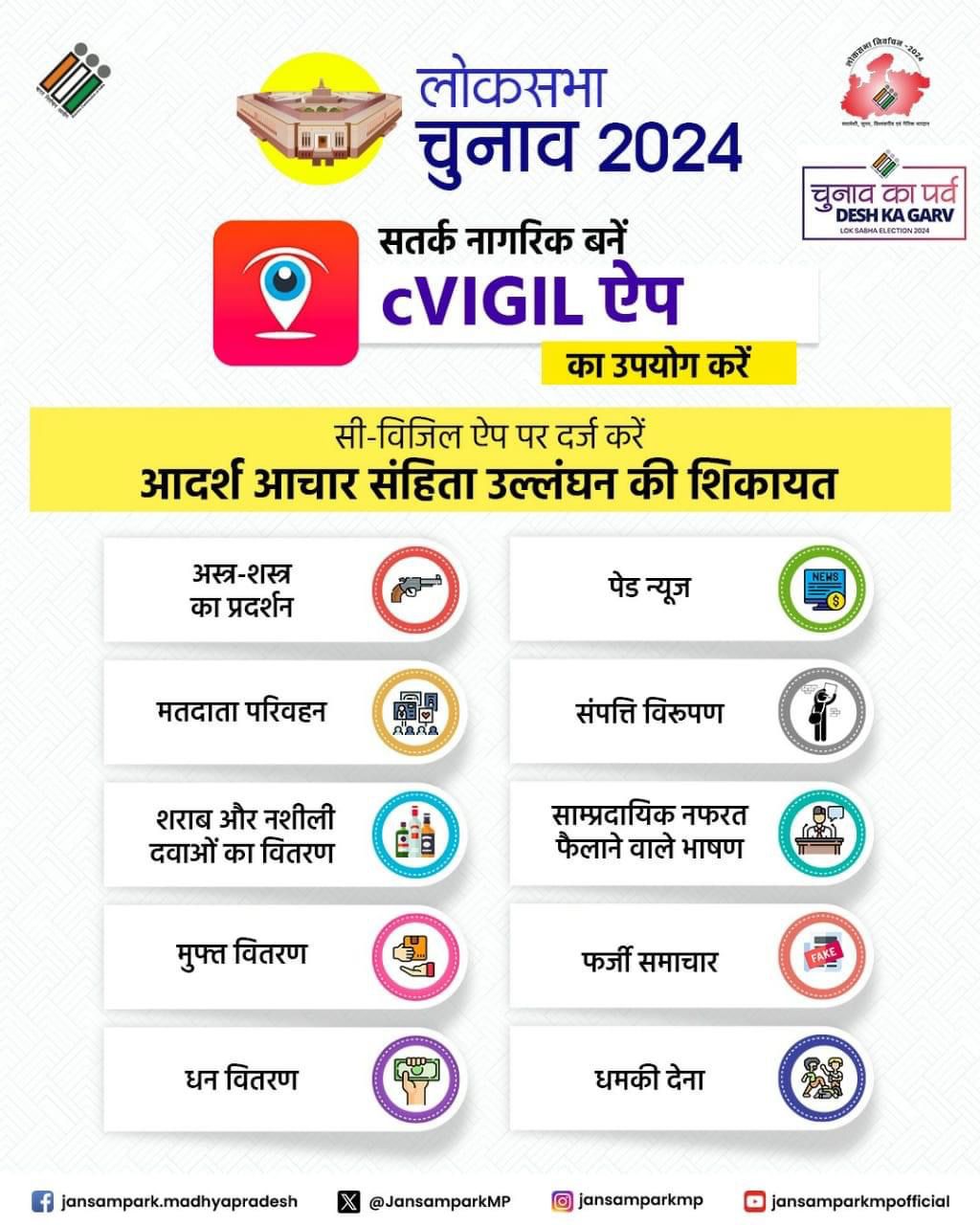 नरसिंहपुर, : भारत निर्वाचन आयोग ने सी-विजिल नामक एक सरल लेकिन प्रभावी मोबाईल एप डिजाइन और विकसित की है। यह मोबाईल एप्लीकेशन निर्वाचन के दौरान जागरूकता, विश्वास और आत्मविश्वास पैदा करके नागरिकों के साथ विश्वास आधारित साझेदारी को सुगम बनाता है। भारत निर्वाचन आयोग द्वारा तैयार सी-विजिल मोबाईल एप निर्वाचनों के दौरान आदर्श आचार संहिता का उल्लंघन करने जैसे रिश्वतखोरी, मुफ्त उपहार, शराब वितरण, अनुमत्य समय के बाद लाउडस्पीकर बजाने वालों के खिलाफ नागरिकों को रिपोर्ट करने के लिए सशक्त बनाता है। इस मोबाइल एप का उपयोग करके नागरिक लाइव फोटो या वीडियो कैप्चर तैयार करते हैं। निर्वाचन तंत्र उल्लंघन का साक्ष्यिक सबूत मिलते ही तुरंत कार्रवाई करने के लिए तैयार हो जाता है। हर सी-विजिल मामले पर कार्रवाई की जाती है और 100 मिनट की समयावधि के दौरान की गई कार्रवाई के साथ वापिस जवाब भेजा जाता है। इसे मोबाईल के प्ले स्टोर में जाकर सी-विजिल मोबाईल एप डाउनलोड किया जा सकता है।