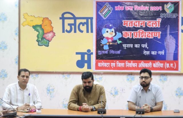 कोरिया : लोकसभा निर्वाचन 2024 में महिला, दिव्यांग एवं युवा मतदान दलों की भागीदारी सुनिश्चित करने जिला निर्वाचन कार्यालय द्वारा विशेष पहल की जा रही है। इसके तहत 10 संगवारी मतदान केन्द्रों में सिर्फ महिला मतदान दल एवं 1-1 मतदान केन्द्रों में दिव्यांग एवं युवा मतदान दलों द्वारा आगामी 7 मई को मतदान कराया जाएगा। मतदान प्रक्रिया के लिए सभी महिला मतदान दलों को जिला पंचायत के ऑडिओरियम में एवं दिव्यांग व युवा मतदान दलों को सभाकक्ष में मास्टर ट्रेनर्स द्वारा प्रशिक्षण दिया जा रहा है।