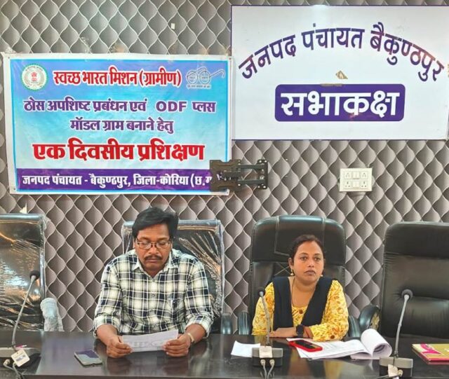 कोरिया : कलेक्टर श्री विनय कुमार लंगेह के निर्देशन और ज़िला पंचायत के मुख्य कार्यपालन अधिकारी डॉ. आशुतोष चतुर्वेदी के मार्गदर्शन में 12 जून को जनपद पंचायत बैकुण्ठपुर के सभाकक्ष में 50 ग्राम पंचायत के सरपंच, सचिव एवं स्वच्छता दीदियों को कचरा कलेक्शन के बारे में प्रशिक्षण दिया गया।