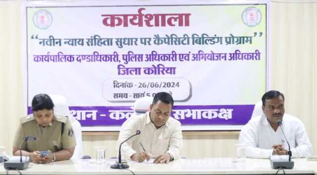 कोरिया : नवीन न्याय संहिता सुधार पर कैपेसिटी बिल्डिंग प्रोग्राम पर कार्यशाला का आयोजन जिला कलेक्ट्रेट सभाकक्ष में आयोजित की गई। जिला अभियोजन अधिकारी श्री हरेन्द्र पाण्डेय ने देश में 1 जुलाई 2024 से लागू हो रहे भारतीय नागरिक सुरक्षा संहिता 2023, भारतीय न्याय संहिता 2023 एवं भारतीय साक्ष्य अधिनियम 2023 के उद्देश्य तीनों नए कानूनों की मूल भावना इसके महत्वपूर्ण नवीन प्रावधानों आदि के संबंध में विस्तारपूर्वक जानकारी दी गई।