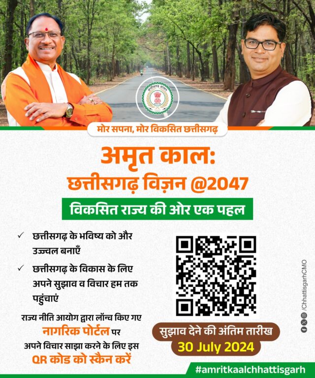 सुझाव ऑनलाइन पोर्टल मोर सपना, मोर विकसित छत्तीसगढ़ के माध्यम से भेजे जा सकते हैं। आम नागरिक 30 जुलाई 2024 तक https: //sdgspc. cg.gov.in/viksitcg/#/home लिंक के माध्यम से या कोड को स्कैन कर मोर सपना, मोर विकसित छत्तीसगढ़ पोर्टल के माध्यम से अपने सुझाव राज्य नीति आयोग को दे सकते हैं।