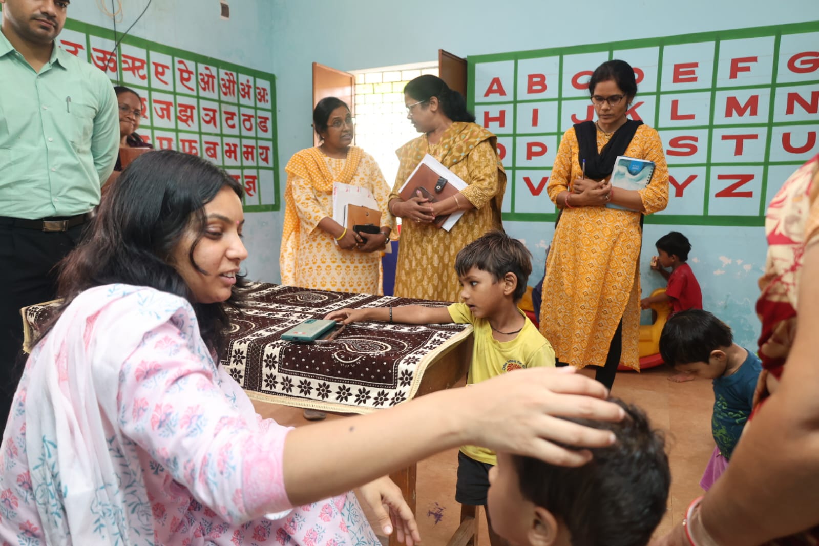 कलेक्टर ने आंगनबाड़ी केन्द्र के रिकॉर्ड का अवलोकन करते हुए यहां दर्ज बच्चों, उपस्थित बच्चों और प्राइवेट स्कूल में जाने वाले बच्चों की जानकारी ली। उन्होंने आंगनबाड़ी कार्यकर्ता से लाड़ली बालिकाओं की ई- केवायसी एवं डीबीटी की जानकारी ली। गर्भवती व धात्री महिलाओं की आभा आर्डडी बनाने के लिए कहा। उन्होंने कहा कि बच्चों की भी आभा आईडी बनाई जाये। यहाँ मौजूद आंगनबाड़ी कार्यकर्ता के विभागीय मोबाइल एप सम्पर्क एवं पोषण ट्रैकर की जानकारी भी ली।