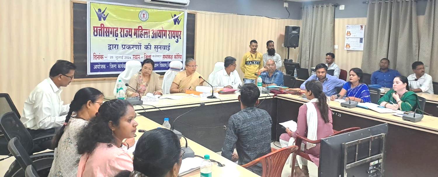 कोरिया : छत्तीसगढ़ राज्य महिला आयोग की अध्यक्ष डॉ. किरणमयी नायक एवं सदस्य श्रीमती नीता विश्वकर्मा ने आज जिला पंचायत सभाकक्ष बैकुठपुर में महिला उत्पीड़न से संबधित प्रकरणों पर सुनवाई की छ०ग० राज्य महिला आयोग की अध्यक्ष डॉ. किरणमयी नायक की अध्यक्षता में आज प्रदेश स्तर की 260 वीं सुनवाई हुई तथा जिला स्तर में 7 वीं सुनवाई की गई। कोरिया जिला में आज की जन सुनवाई में कुल 36 प्रकरणों में सुनवाई हुई ।