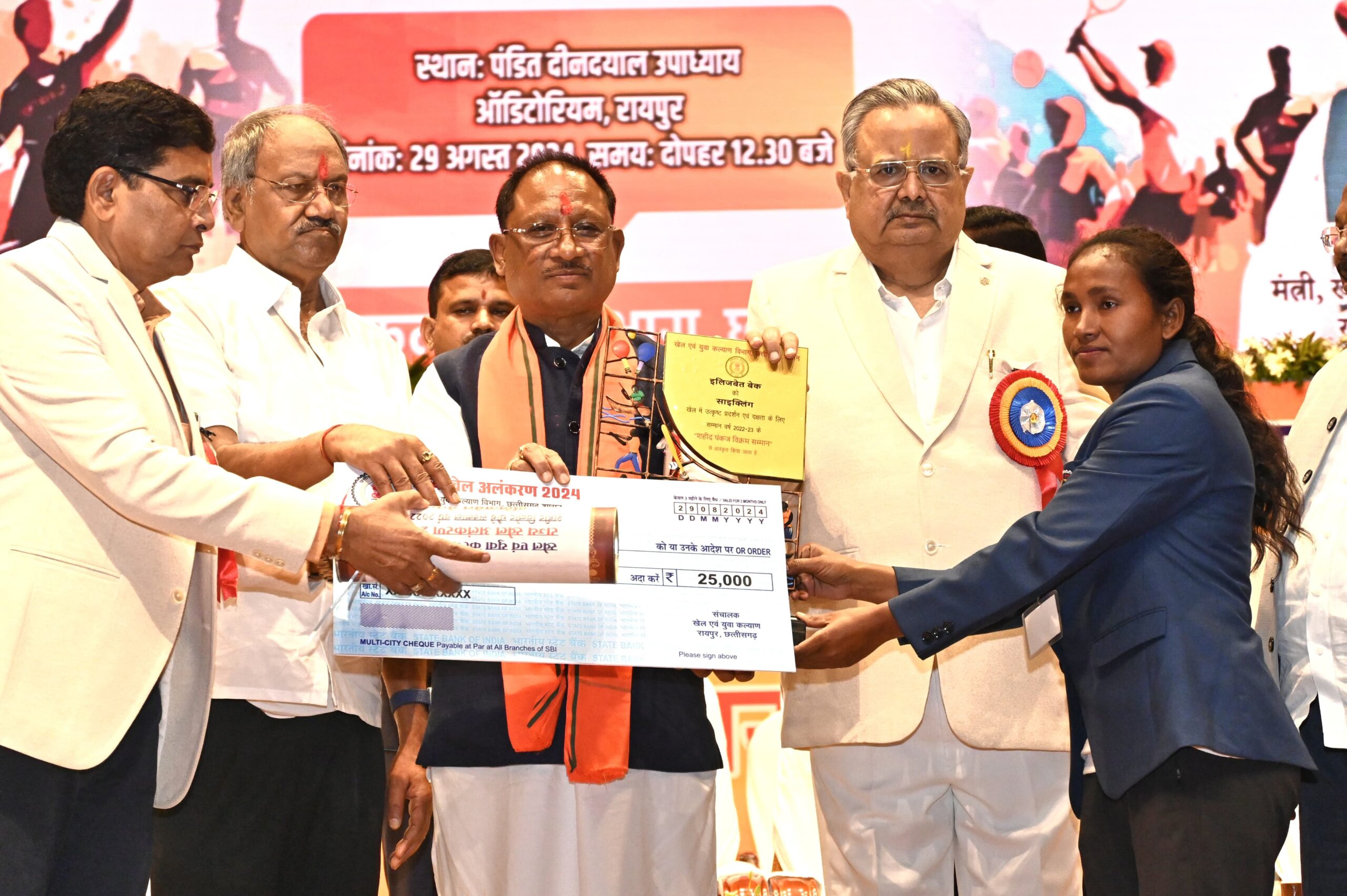 जशपुरनगर : मुख्यमंत्री श्री विष्णु देव साय द्वारा राष्ट्रीय खेल दिवस 29 अगस्त के अवसर पर राजधानी रायपुर के पंडित दीनदयाल उपाध्याय ऑडिटोरियम में आयोजित राज्य खेल अलंकरण समारोह में विभिन्न खेल विधाओं के 502 प्रतिभावान खिलाड़ियों को पुरस्कृत किया गया और उन्हें 01 करोड़ 36 लाख रूपए वितरित की गई। इस खेल अंलकरण समारोह मे जशपुर जिले की सुश्री इलिजबेत बेक को भी साइक्लिंग में उत्कृष्ट प्रदर्शन के आधार पर शहीद पंकज विक्रम सम्मान 2022-23 से सम्मानित किया गया। सम्मान मिलने पर उत्साहित सुश्री बेक ने मुख्यमंत्री श्री साय को धन्यवाद दिया है और कहा कि वह आगे भी अपने प्रदर्शन से राज्य का नाम रोशन करेगी।