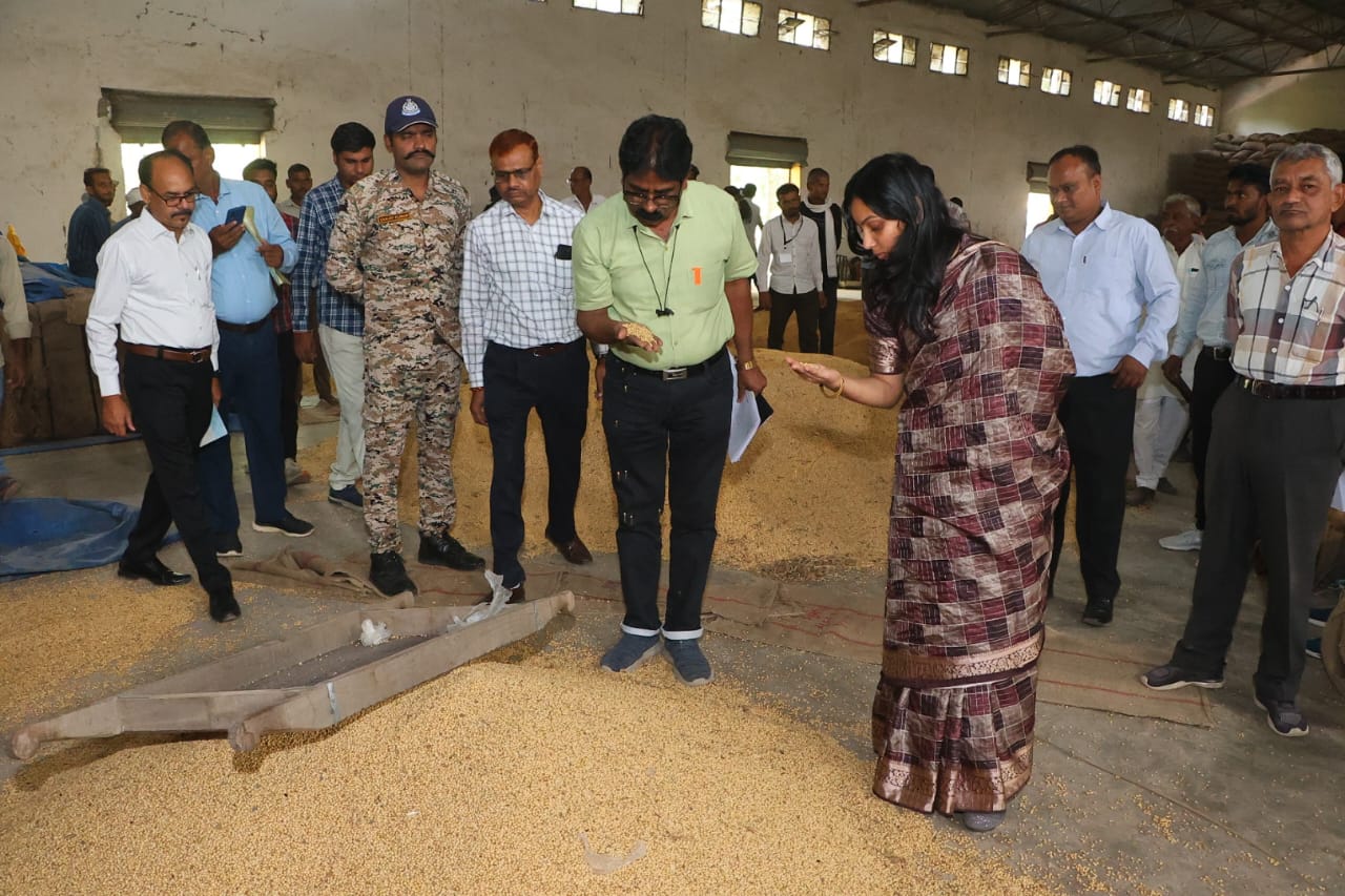 नरसिंहपुर : समर्थन मूल्य पर जिले में सोयाबीन उपार्जन का कार्य क्रियान्वित किया जा रहा है। इन केन्द्रों पर उपार्जन नीति के अनुसार किए जाने वाले प्रबंधों का कलेक्टर श्रीमती शीतला पटले ने बुधवार को भ्रमण कर जायजा लिया। उन्होंने विकासखंड करेली एवं चीचली के समर्थन मूल्य पर पंजीकृत उपार्जन केंद्र गोदाम 3 एसी करेली एवं गुरुकृपा वेयर हाउस वटेसरा का औचक निरीक्षण किया।