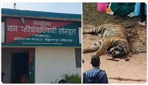 कोरिया : सरगुजा वनवृत्त अंबिकापुर के मुख्य वन संरक्षक द्वारा कोरिया वनमण्डल बैकुण्ठपुर के परिक्षेत्राधिकारी सोनहत के वन क्षेत्रपाल श्री विनय कुमार सिंह से क्षेत्र में टाईगर मृत्यु के संबंध में स्पष्टीकरण मांगा गया है। मुख्य वन संरक्षक अंबिकापुर ने बताया कि वनमण्डलाधिकारी, कोरिया वनमण्डल, बैकुन्ठपुर अंतर्गत परिक्षेत्र सोनहत के बीट गरनई, कक्ष कमांक पी 196 वनभूमि कुदरी में खनखोपड़ नाला के किनारे 01 टाईगर मृत्यु (उम्र लगभग 4-5 वर्ष) की सूचना मिली थी। सूचना प्राप्त होते ही वनमण्डलाधिकारी, कोरिया वनमण्डल, बैकुन्ठपुर और संचालक गुरु घासीदास रा. उद्यान बैकुन्ठपुर के साथ मौके पर पहुंचीं। 01 नर टाईगर खनखोपड नाला के किनारे मृत अवस्था में पाया गया। पोस्टमार्टम के दौरान पशु चिकित्सक के द्वारा प्राथमिक जांच में शव 4-5 दिन पुराना होना बताया गया है। उक्त टीम के अभिमत अनुसार बाघ की मृत्यु का कारण जहरखुरानी संभावित है।