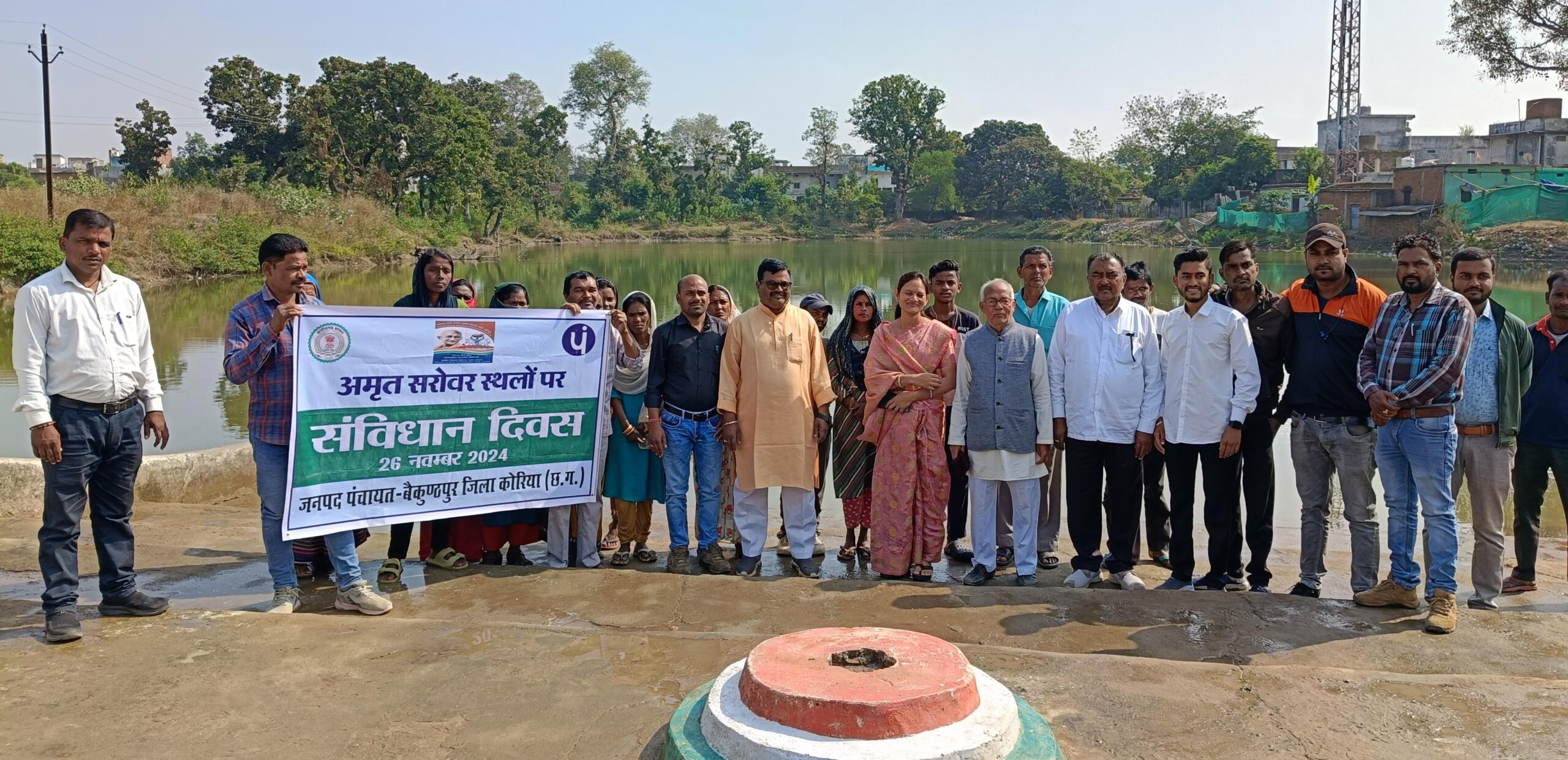 बैकुंठपुर और सोनहत जनपद पंचायत क्षेत्रों के अमृत सरोवर स्थलों पर सामूहिक रूप से संविधान की प्रस्तावना का पाठ किया गया। नागरिकों ने सरोवर की सफाई की और संकल्प लिया कि वे संविधान की रक्षा और इसके आदर्शों को अपने जीवन में अपनाने के लिए सतत प्रयासरत रहेंगे।