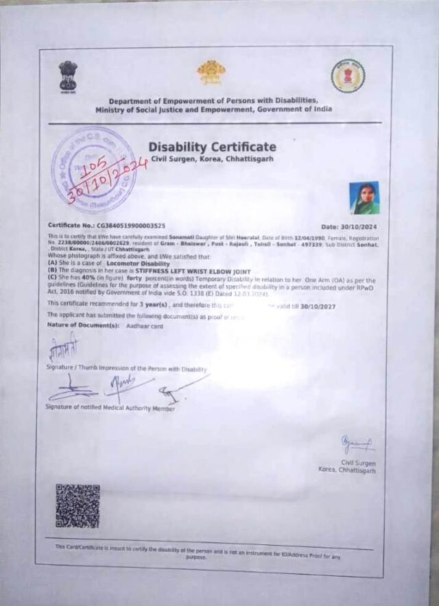 कलेक्टर ने उसकी बात ध्यान से सुनी और तत्काल समाज कल्याण विभाग को निर्देश दिया। सोनामती के लिए यह एक उम्मीद की किरण थी। कुछ ही दिनों में विकलांग प्रमाण-पत्र बनकर उनके हाथों में था।