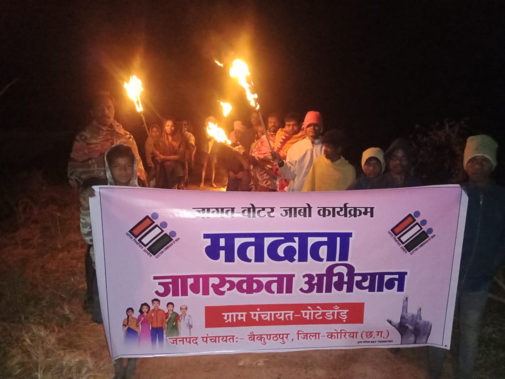 जनपद पंचायत बैकुंठपुर के मुख्य कार्यपालन अधिकारी ए. पन्ना ने बताया कि सभी ग्राम पंचायतों में रात के समय मशाल रैली निकाली गई। रैली के माध्यम से ग्रामीणों को मतदान की प्रक्रिया में सक्रिय भागीदारी की अपील की गई। रैली में बड़ी संख्या में ग्रामीण शामिल हुए और मतदान के महत्व को समझा।