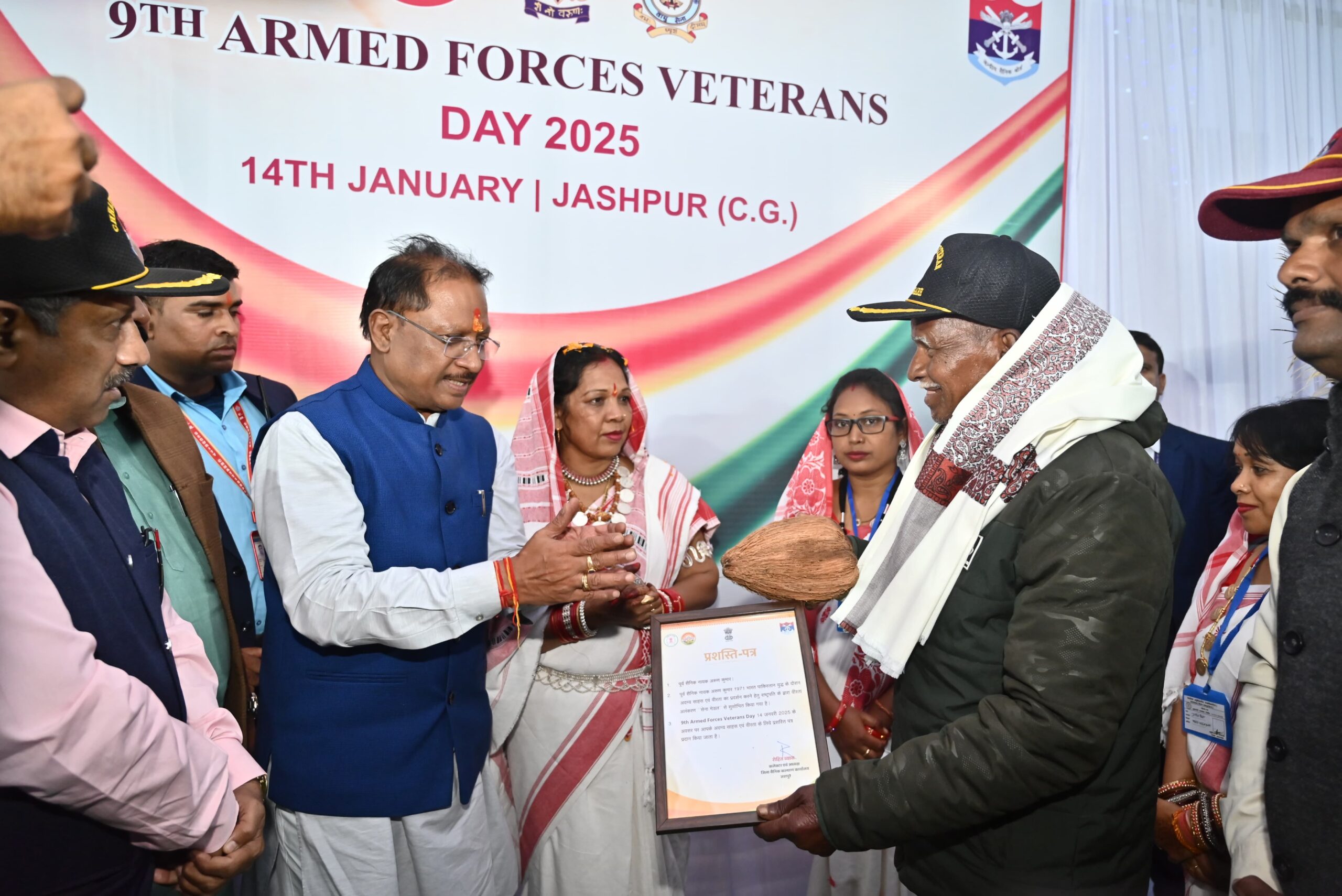 जशपुरनगर 15 जनवरी 2025/ जशपुर के विकासखण्ड फरसाबहार के ग्राम पगुराबहार में मुख्यमंत्री श्री विष्णुदेव साय ने 9वें सशस्त्र सेना के भूतपूर्व सैनिक दिवस वेटनर डे पर सेना के वीर जवानों के बलिदान और वीरता को नमन किया। इस अवसर पर मुख्यमंत्री ने 1971 के युद्ध में अपनी अभूतपूर्व वीरता एवं अदम्य साहस का प्रदर्शन करने वाले जशपुर के भागलपुर निवासी 81 वर्षीय नायक अरुण कुमार का सम्मान किया। अरुण कुमार ने 1961 में थल सेना के इलेक्ट्रॉनिक एवं मैकेनिकल इंजीनियरिंग कोर में पदस्थ हुए थे। 1971 के भारत पाकिस्तान युद्ध के दौरान देश की रक्षा करते हुए उन्होंने अदम्य साहस का परिचय दिया था। जिसके लिए उन्हें राष्ट्रपति के द्वारा वीरता अलंकार सेना मेडल से सुशोभित किया गया। मुख्यमंत्री श्री साय ने अरुण कुमार को शाल, श्रीफल एवं प्रशस्ति पत्र द्वारा सम्मानित किया। श्री अरूण कुमार ने अपने युद्ध के अनुभव भी मुख्यमंत्री से साझा किये।