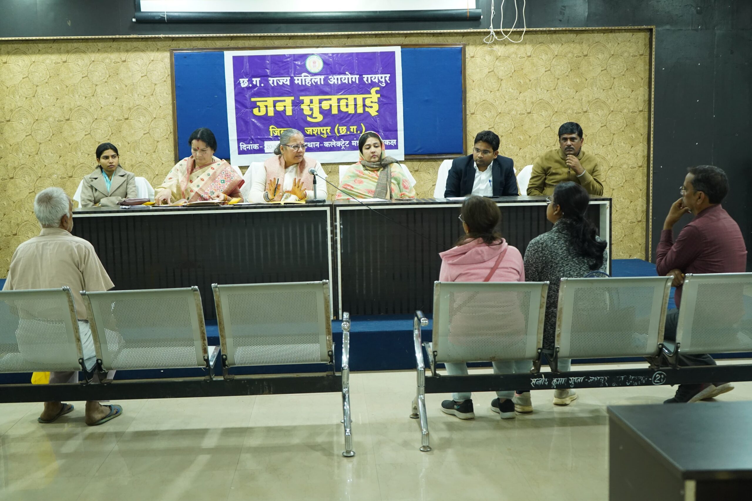 जशपुरनगर : छत्तीसगढ़ राज्य महिला आयोग की अध्यक्ष डॉ. किरणमयी नायक एवं सदस्य गण श्रीमती प्रियम्वदा सिंह जूदेव व श्रीमती सरला कोसरिया द्वारा आज कलेक्ट्रेट सभा कक्ष जशपुर में महिला उत्पीड़न से संबंधित प्रकरणों पर सुनवाई की। इस अवसर पर जिला पंचायत सीईओ श्री अभिषेक कुमार महिला बाल विकास विभाग के जिला कार्यक्रम अधिकारी श्री अजय शर्मा आयोग के अध्यक्ष डॉ. किरणमयी नायक की अध्यक्षता में प्रदेश स्तर पर आज 302 सुनवाई हुई। जशपुर जिले में 5 वि. जनसुनवाई.