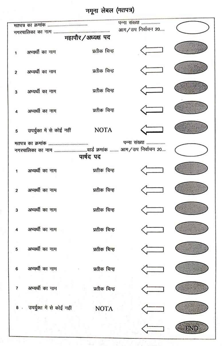 उक्त से स्पष्ट है कि उपरोक्त व्यवस्था के अनुसार निर्धारित लेबल (मतपत्र) (सफेद रंग) के सबसे ऊपर महापौर/अध्यक्ष मुद्रित कराया जाना है। तत्पश्चात के पैनल में महापौर/अध्यक्ष पद के निर्वाचन लड़ने वाले अभ्यर्थियों का क्रमवार नाम एवं अंतिम नाम के पैनल के नीचे उपर्युक्त में से कोई नहीं (NATO) का पैनल होगा। इसके पश्चात् के पैनल में पार्षद पद का उल्लेख किए जाने के निर्देश है। तत्पश्चात के पैनलों में पार्षद पद के अभ्यर्थियों के नाम होंगे। पार्षद पद के निर्वाचन लड़ने वाले अभ्यर्थियों के अंतिम पैनल के नीचे उपर्युक्त में से कोई नहीं (NATO) का उल्लेख किया जाना है। पार्षद पद का उल्लेख जिस पैनल पर किया जाना है। उसे दो भागों में विभक्त कर ऊपर के भाग में निर्वाचन की विशिष्टियां मुद्रित करायी जाये तथा नीचे के भाग में पार्षद पद का उल्लेख कर दिये जाने से पार्षद पद के लेवल (मतपत्र) की पहचान स्थापित की जा सकती है। दोनों पदों के लेबल (मतपत्र) में विशिष्टियां बाई ओर के कोने में मतपत्र का क्रमांक, नगरपालिका का नाम तथा वार्ड क्रमांक एवं दायी ओर के कोने में पन्ना संख्या तथा आम/उप निर्वाचन 20…. वर्ष का उल्लेख किया जाये।