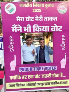 जशपुरनगर : नगरीय निकाय आम निर्वाचन के तहत अपर कलेक्टर श्री प्रदीप कुमार साहू और एसडीएम जशपुर श्री ओंकार यादव ने जशपुरनगर के शासकीय बालक उच्चतर माध्यमिक विद्यालय के मतदान केन्द्र में मतदान किया