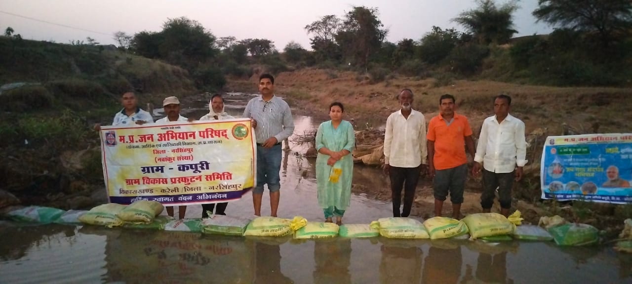 नरसिंहपुर, 01 अप्रैल 2025. जिले में जल गंगा संवर्धन अभियान की शुरूआत 30 मार्च से हो चुकी है, जो लगातार आगामी 30 जून तक चलाया जायेगा। अभियान की शुरूआत से ही जिले में लगातार जल संरक्षण व संवर्धन के कार्य किये जा रहे हैं। इसी क्रम में जल संरक्षण व संवर्धन की दिशा में जिले के ग्राम कठोतिया के बारूरेवा नदी में 106 बोरियों का बंधान किया गया, जो जल संरक्षण व संवर्धन की दिशा में प्रभावी पहल है। यह बोरी बंधान का कार्य मप्र जनअभियान परिषद करेली के तत्वावधान में नवांकुर संस्था कपूरी एवं विकास विकास प्रस्फुटन समिति कठोतिया के कार्यकर्ताओं और आम नागरिकों की सहभागिता से किया गया है।