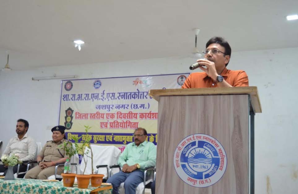 जशपुरनगर : शासकीय रामभजन राय एन.ई.एस. स्नातकोत्तर महाविद्यालय जशपुरनगर में बुधवार को राष्ट्रीय सेवा योजना (रासेयो) के तत्वावधान में श्सड़क सुरक्षा एवं स्वयं नशामुक्त समाज के लिए युवाश् विषय पर एक दिवसीय जिला स्तरीय कार्यशाला एवं प्रतियोगिता का आयोजन किया गया। इस कार्यशाला में मुख्य अतिथि के रूप में वरिष्ठ पुलिस अधीक्षक शशिमोहन सिंह भी शामिल हुए जहां उन्होंने युवाओं को संबोधित करते हुए सड़क सुरक्षा की अनिवार्यता पर बल दिया। उन्होंने कहा कि युवाओं को दुपहिया वाहन चलाते वक्त हेलमेट का अवश्य प्रयोग करना चाहिए एवं नशे से दूरी बनाते हुए कभी भी नशीले पदार्थों का सेवन कर वाहन नहीं चलाना चाहिए। उन्होंने युवाओं में बढ़ते सोशल मीडिया के बढ़ते प्रयोग को देखते हुए उन्होंने डिजिटल उपवास और सोशल मीडिया की लत पर नियंत्रण को वर्तमान की प्राथमिक आवश्यकता बताया। उन्होंने युवाओं से आग्रह किया कि वे जागरूक, जिम्मेदार नागरिक बनें और समाज के प्रति अपने कर्तव्यों को समझें।