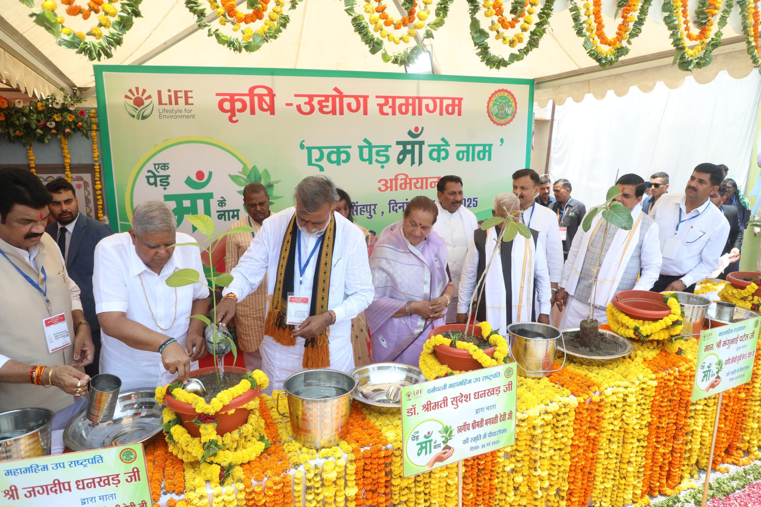 नरसिंहपुर : उप राष्ट्रपति श्री जगदीप धनखड़, श्रीमती सुदेश धनखड़, राज्यपाल श्री मंगुभाई पटेल और मुख्यमंत्री डॉ. मोहन यादव ने नरसिंहपुर में आयोजित कृषि उद्योग समागम कार्यक्रम परिसर में “एक पेड़ माँ के नाम” अभियान के तहत पौधरोपण किया।