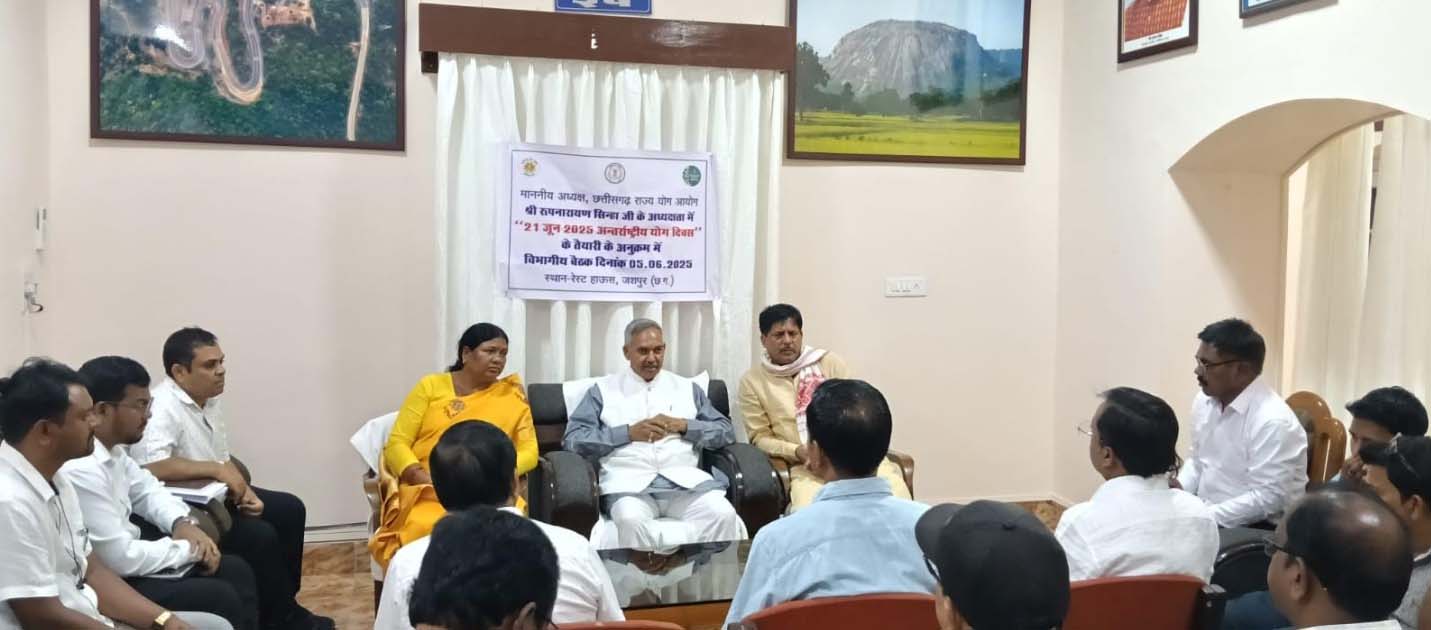 जशपुरनगर : आगामी 21 जून को अंतर्राष्ट्रीय योग दिवस के अवसर पर राज्य स्तरीय वृहद सामूहिक योगाभ्यास का कार्यक्रम जिला जशपुर में होना प्रस्तावित है। उक्त कार्यक्रम के तैयारी के संबंध गुरुवार को रेस्ट हाउस जशपुर में बैठक आयोजित की गई जिसमें छत्तीसगढ़ राज्य, योग आयोग के अध्यक्ष श्री रुपनारायण सिन्हा का संक्षिप्त प्रवास जिले में था। कार्यक्रम के सफल सम्पादन के लिए अध्यक्ष के निर्देशन एवं जिला कलेक्टर श्री रोहित व्यास के मार्गदर्शन, तथा स्थानीय विधायक श्रीमती रायमुनी भगत, अध्यक्ष नगर पालिका परिषद श्री अरविन्द भगत, अध्यक्ष जनपद पंचायत श्री गंगा राम भगत, भरत सिंह तथा सम्बधित विभागों के अधिकारियों के उपस्थिति में बैठक सम्पन्न हुआ।