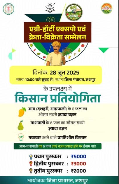 जशपुरनगर : जशपुर जिले में कृषि क्रांति अभियान अंतर्गत एग्री हॉर्टी एक्सपो क्रेता-विक्रेता सम्मेलन का दो दिवसीय आयोजन दिनांक 28 एवं 29 जून 2025 तक जिला पंचायत जशपुर में किया जा रहा है। जिले के प्रगतिशील कृषकों को प्रोत्साहित करने के उद्देश्य से जिला प्रशासन द्वारा आम, नाशपाती एवं नवाचार करने वाले किसानों की प्रतियोगिता का आयोजन किया गया है। जिसमें 28 जून को प्रतियोगिता में भाग लेने वाले आम (दशहरी एवं आम्रपाली) तथा नाशपाती उत्पादक कृषक जो की प्रतियोगिता में भाग लेना चाहते है, एक फसल अथवा किस्म का 06-06 फल लेकर आ सकते हैं तथा सभी फलों के वजन को जोडकर औसत भार अधिक होने पर किसान को श्रेणी के आधार पर क्रमशः 5 हजार रुपये , 3 हजार रुपये एवं 2 हजार रुपये प्रोत्साहन राशि दिया जावेगा। इसके साथ ही नवाचार के क्षेत्र में उत्कृष्ट कार्य करने वाले प्रगतिशील किसान निर्धारित आवेदन पत्र में अपनी जानकारी दे सकते हैं जिसका मूल्यांकन समिति द्वारा मूल्यांकन के आधार पर विजेता किसान को प्रथम पुरस्कार प्राप्त करने पर प्रोत्साहन राशि 5 हजार रुपये प्रदान किया जावेगा।