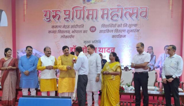 नरसिंहपुर : मुख्यमंत्री डॉ. मोहन यादव ने गुरु पूर्णिमा के अवसर पर कमला नेहरु सांदीपनि विद्यालय भोपाल में आयोजित कार्यक्रम में नरसिंहपुर जिले के शासकीय उच्चतर माध्यमिक विद्यालय गोरखपुर के प्राचार्य डॉ. एसके पाल को उनकी उल्लेखनीय उपलब्धियों के लिए सम्मानित किया। इस अवसर पर प्रदेश के स्कूल शिक्षा एवं परिवहन मंत्री श्री उदय प्रताप सिंह, अन्य जनप्रतिनिधि और वरिष्ठ अधिकारी मौजूद थे।