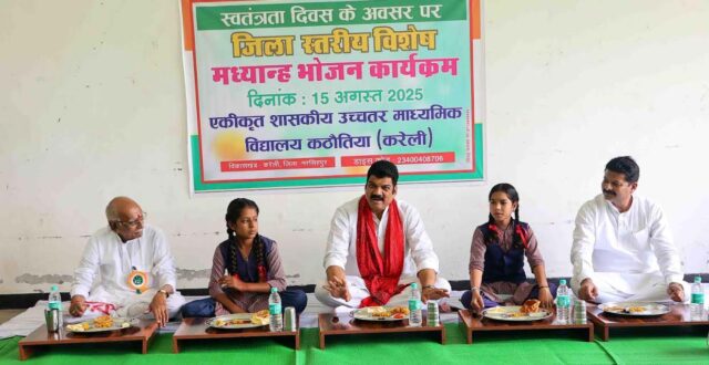 नरसिंहपुर : प्रदेश शासन के खाद्य, नागरिक आपूर्ति एवं उपभोक्ता संरक्षण विभाग और जिले के प्रभारी मंत्री श्री गोविंद सिंह राजपूत 15 अगस्त स्वतंत्रता दिवस के अवसर पर एकीकृत हाई स्कूल कठौतिया में आयोजित जिला स्तरीय (विशेष भोज) मध्यान्ह भोजन के कार्यक्रम में शामिल हुए। उन्होंने विद्यार्थियों के साथ भोजन कर उनसे संवाद किया। प्रभारी मंत्री श्री राजपूत ने शाला प्रांगण में एक पेड़ मां के नाम अभियान के तहत आंवला का पौधा भी रोपा। इस अवसर पर जिला पंचायत अध्यक्ष श्रीमती ज्योति नीलेश काकोड़िया, विधायक श्री विश्वनाथ सिंह पटेल, पूर्व राज्यमंत्री श्री जालम सिंह पटेल, जिला पंचायत उपाध्यक्ष श्रीमती अनीता राजेन्द्र ठाकुर, श्री रामसनेही पाठक, कलेक्टर श्रीमती शीतला पटले, सीईओ जिला पंचायत श्री दलीप कुमार, डीएफओ, अतिरिक्त पुलिस अधीक्षक श्री संदीप भूरिया सहित अन्य जनप्रतिनिधि, अधिकारी- कर्मचारी और विद्यार्थी मौजूद थे। विशेष भोज में सब्जी- पूरी- खीर, पापड़, सलाद आदि परोसा गया।