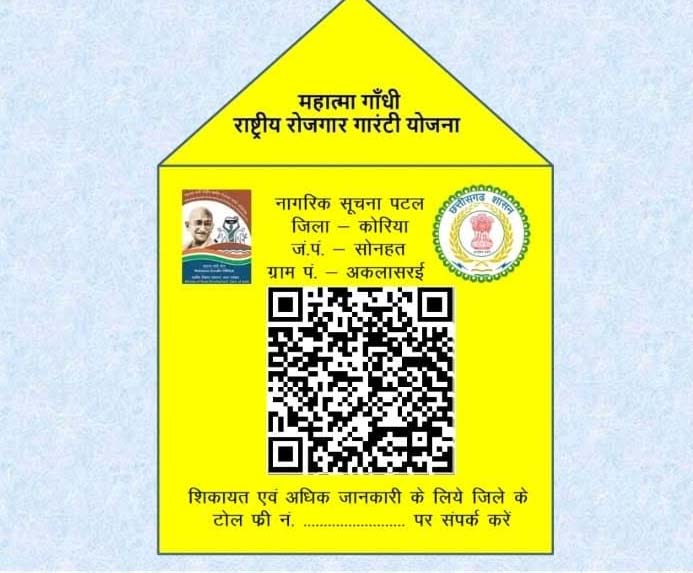 कलेक्टर कोरिया श्रीमती चंदन त्रिपाठी के निर्देशन में महात्मा गांधी राष्ट्रीय ग्रामीण रोजगार गारंटी योजना के तहत प्रत्येक ग्राम पंचायतों में क्यूआर कोड चस्पा किया जा रहा है। इस क्यूआर कोड को कोई भी आम नागरिक स्केन कर मनरेगा योजना के तहत कराए गए सभी कार्यों की डिटेल जानकारी अविलंब प्राप्त कर सकते हैं। साथ ही बीते तीन वर्षों की जानकारी भी इस कोड के स्केन से प्राप्त हो सकेगी। इस माह के अंत तक कोड चस्पा करने का यह कार्य पूर्ण कर लिया जाएगा।