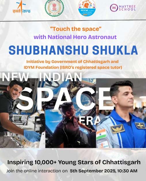 जशपुरनगर : भारत के दूसरे अंतरिक्ष तक पहुंचने वाले गगनयात्री और भारत के अंतरिक्ष हीरो कहलाने वाले श्री शुभांशु शुक्ला से शिक्षक दिवस के अवसर पर छत्तीसगढ़ के मुख्यमंत्री श्री विष्णुदेव साय श्टच द स्पेसश् कार्यक्रम के तहत रूबरू होंगे। इसरो, आईडीवायएम फाउंडेशन की ओर से आयोजित इस कार्यक्रम में गगनयात्री शुभांशु शुक्ला अंतरिक्ष मिशन के लिए अपनी तैयारियों, अपने अनुभव, गगनयात्री बनने के अपने सफर, भारत के अंतरिक्ष अभियानों आदि विषयों पर अपने अनुभव और ज्ञान को साझा करेंगे। यह एक अनोखा मौका होगा जब भारत के राष्ट्रीय अंतरिक्ष हीरो और प्रदेश के मुख्यमंत्री आपस में वर्चुअल माध्यम से रूबरू होंगे और इस कार्यक्रम के साक्षी प्रदेश के 20 हजार से ज्यादा विद्यार्थी बनेंगे।