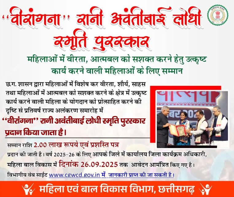 सूरजपुर/15 सितंबर 2025/ छत्तीसगढ़ शासन द्वारा महिलाओं, विशेष कर वीरता, शौर्य, साहस तथा महिलाओं में आत्मबल को सशक्त करने के क्षेत्र में उत्कृष्ट कार्य करने वाली राज्य की महिलाओं को प्रतिवर्ष ‘‘वीरांगना‘‘ रानी अवंतीबाई लोधी स्मृति पुरस्कार प्रदान किया जाना है।
