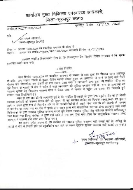 साथ ही इस बात की भी जानकारी हुई है, कि संबंधित हितग्राही के द्वारा 108 एंबुलेंस और ना ही किसी स्वास्थ्य कर्मचारी को स्वास्थ्य खराब होने की सूचना दी गई संबंधित व्यक्ति को दिनांक 14.09.2025 को बुखार आने पर उनके द्वारा ग्राम के मितानिन और ना ही जनप्रतिनिधियों के बताए बिना बांस के बने झेलगी के माध्यम से मेन रोड पर लाया गया मेन रोड से इनके द्वारा वाहन प्राप्त कर सामुदायिक स्वास्थ्य केन्द्र प्रतापपुर आये जहां चिकित्सकों के द्वारा स्वास्थ्य सुविधा उपलब्ध कराते हुये बेहतर स्वास्थ्य सुविधा हेतु मेडिकल कालेज अम्बिकापुर रेफर किया गया किन्तु संबंधित के द्वारा वहां जाने से मना कर दिया गया। जिस पर सामुदायिक स्वास्थ्य केंद्र प्रतापपुर में स्वास्थ्य हित लाभ प्राप्त किया गया।